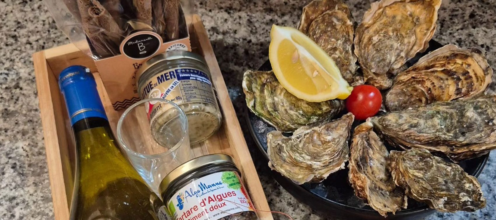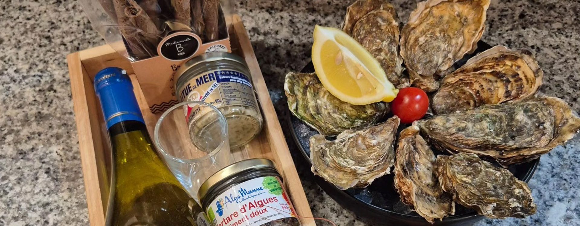Mis à part la dégustation et la vente de fruits de mer, nous disposons également d’une épicerie fine qui propose un grand assortiment de boissons, galettes, conserveries et autres spécialités de la région.